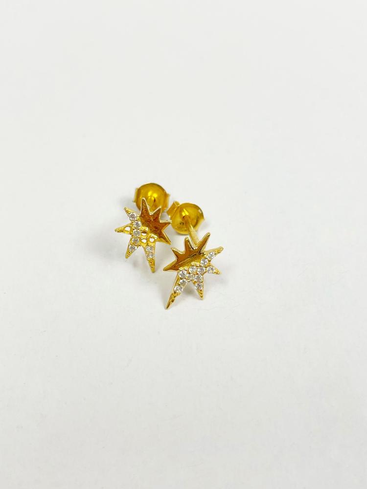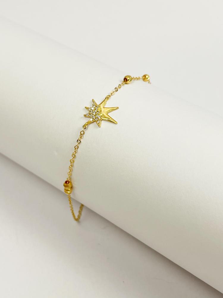 طقم ذهبي عيار 21 بتصميم مستوحى من بريق النجوم, مع قلادة مكونة من أشكال نجمية مميزة وحلي رائعة.