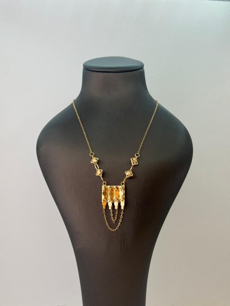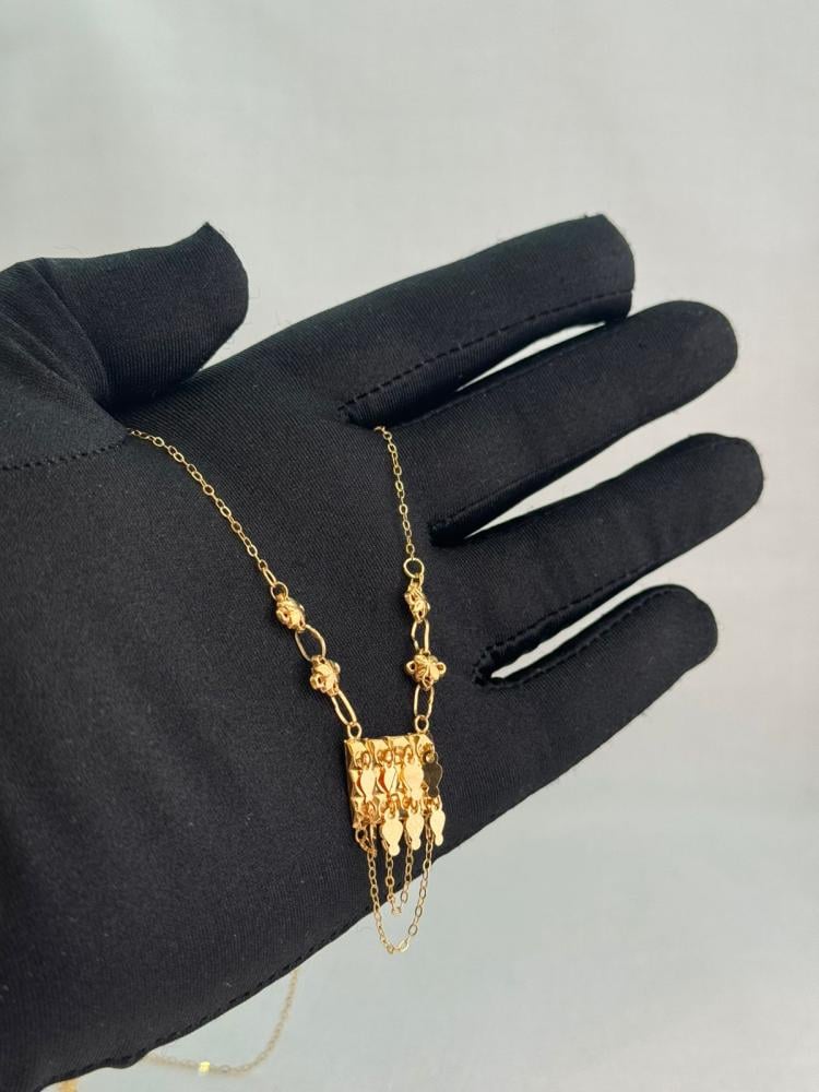 قطعة ذهبية بلمسة تقليدية وعصرية معًا. تتميز بوزنها المثالي وزخارفها المتدلية التي تضفي جاذبية وأناقة خاصة.