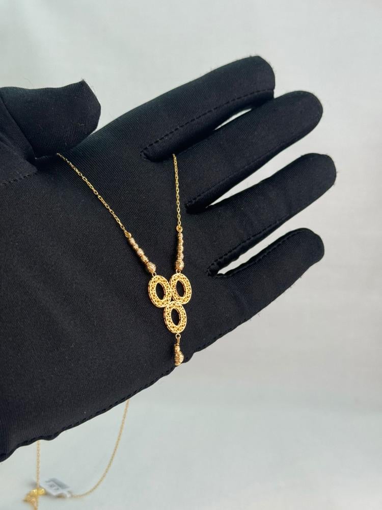 قطعة ذهبية بلمسة تقليدية وعصرية معًا. تتميز بوزنها المثالي وزخارفها المتدلية التي تضفي جاذبية وأناقة خاصة.
